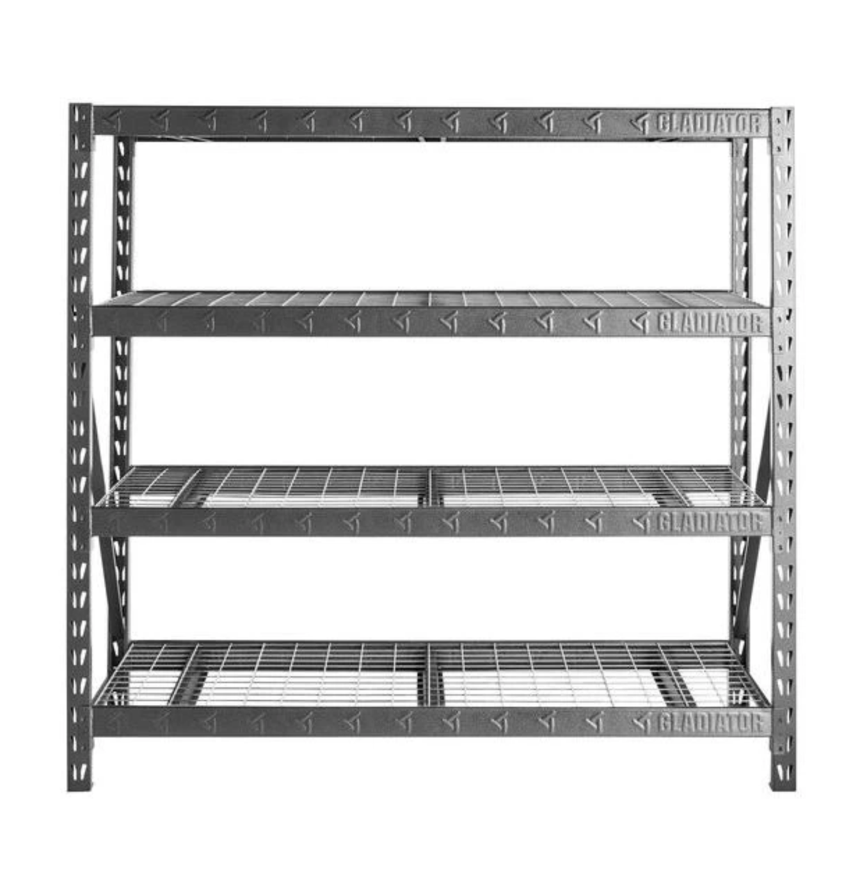 Store large and bulky items on the Gladiator® Rack Shelving unit. This storage unit is fast and easy to assemble at home, and does not require tools. The welded steel frame features four metal shelves that can support up to 2,000 lbs each, and the dual slot profile allows for additional supports and shelves. Also available in 60" wide x 18" deep and 48" wide x 18" deep configurations.