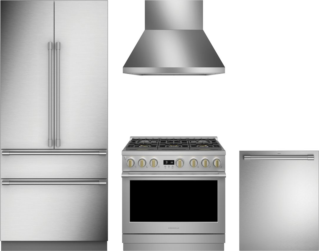 Monogram® 4 Piece Kitchen Package with pro style dual fuel gas range, built in dishwasher, french door refrigerator, and wall mounted range hoodRead More