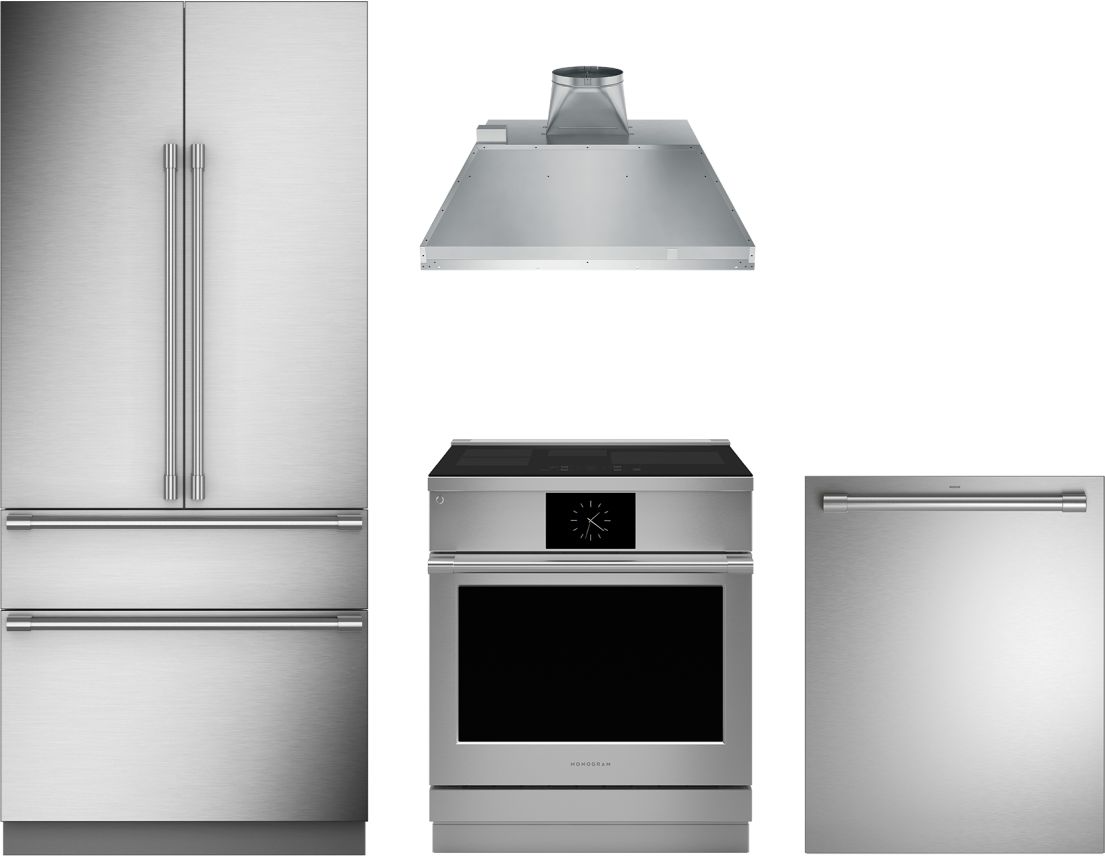Monogram® 4 Piece Kitchen Package with slide in induction range, built in dishwasher, french door refrigerator, and insert range hoodRead More