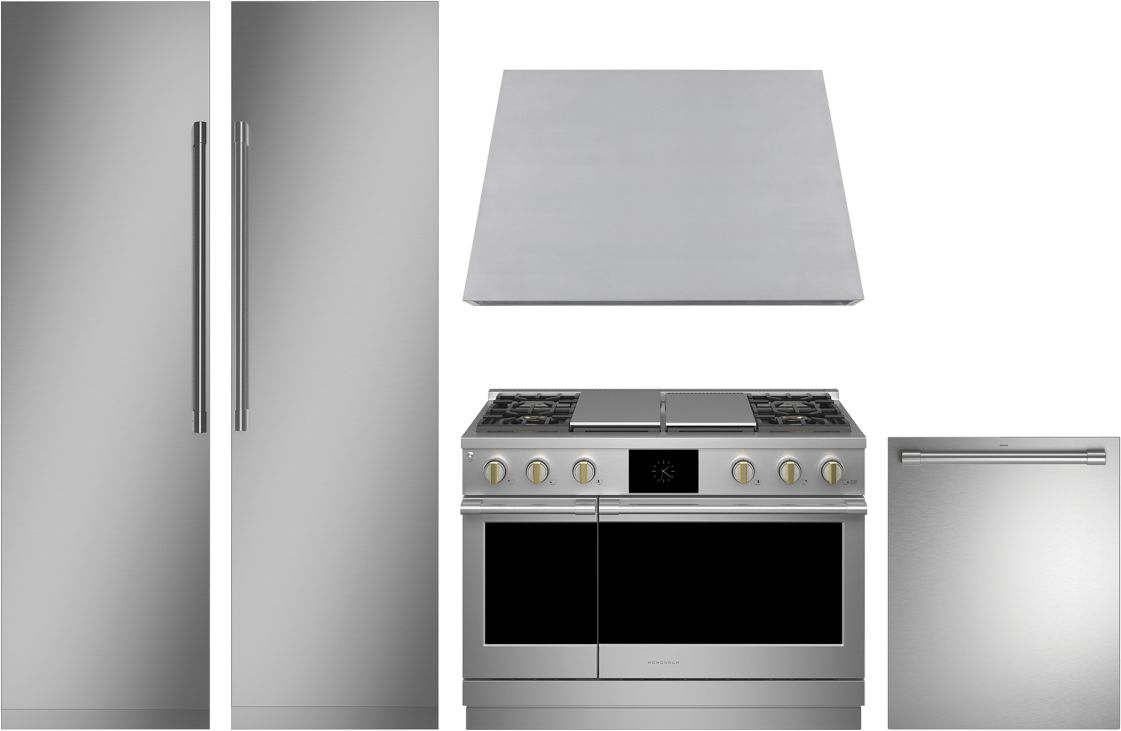 Monogram® 5 Piece Kitchen Package with column refrigerator, column freezer, built in dishwasher, pro style dual fuel gas range, and wall mounted range hoodRead More